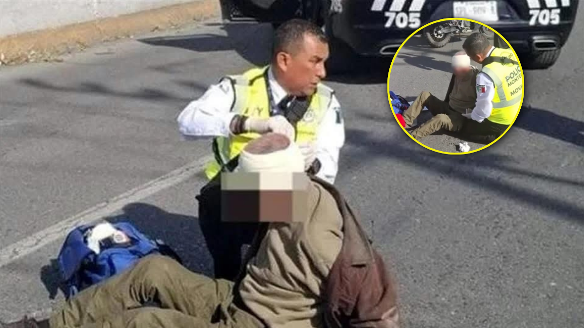 Un elemento de Tránsito de Monterrey acudió al lugar tras el reporte. Al evaluar al adulto mayor, detectó diversos golpes visibles que requerían atención básica inmediata. Sin esperar el arribo de paramédicos, inició maniobras de primeros auxilios.